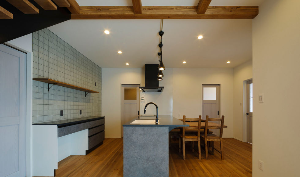 お子さんはもちろん、家族みんなが快適に過ごせる工夫も欠かせません。プレイルームをつくった関係で、リビングの吹き抜けをあきらめたKさん。そこで天井の高さを当初の予定より20cm上げることで空間の明るさを確保し、より広く感じられるように。このリビングとひと続きのオープンキッチンは背面のタイルがアクセント。整然と並ぶ正方形のタイルがシンプルでかっこいいのに、だからといって気取った感じもなく空間になじんでいます。外観同様、LDKにもブラックを使ってメリハリをプラス。キッチンのワークトップ、階段のアイアン手すり、小上がりの和室の畳。ワンポイントで使うことで空間がぐっと引き締まり、より魅力的な空間に仕上がりました。